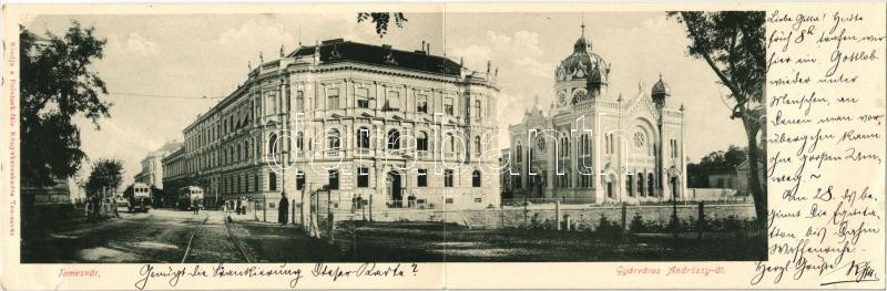 Leírás: 1901 Temesvár, Timisoara; Gyárváros, Andrássy út, villamosok, zsinagóga. Polatsek-féle kiadása, kihajtható panorámalap / Fabrica, street, synagogue, trams. Folding panoramacard