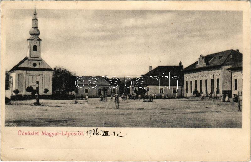 Leírás: 1906 Magyarlápos, Magyar-Lápos, Oláhlápos, Targu Lapus; Fő tér, templom, üzlet / main square, church, shop (r)
