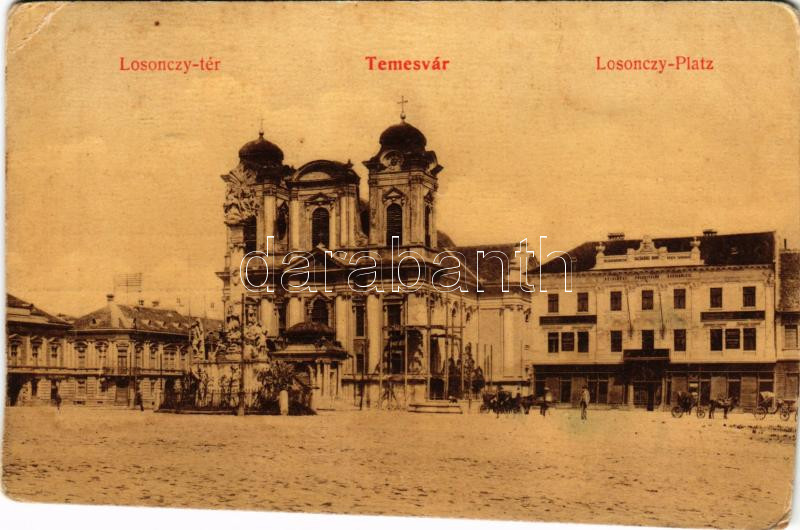 1907 Temesvár, Timisoara; Losonczy tér, templom felállványozva javítási munkához, Délmagyarországi Gazdasági Bank rt., Délvidéki Földművelők Egyesülete, üzletek / square, church in reconstruction, bank, shops, Farmers Association (Rb)