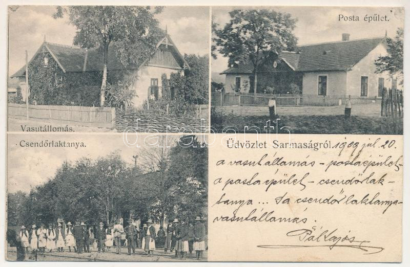 Leírás: 1909 Sarmaság, Sarmasag; vasútállomás, posta, csendőrlaktanya. Domokos Irma kiadása / railway station, post office, K.u.K. gendarmerie barracks (EK)
