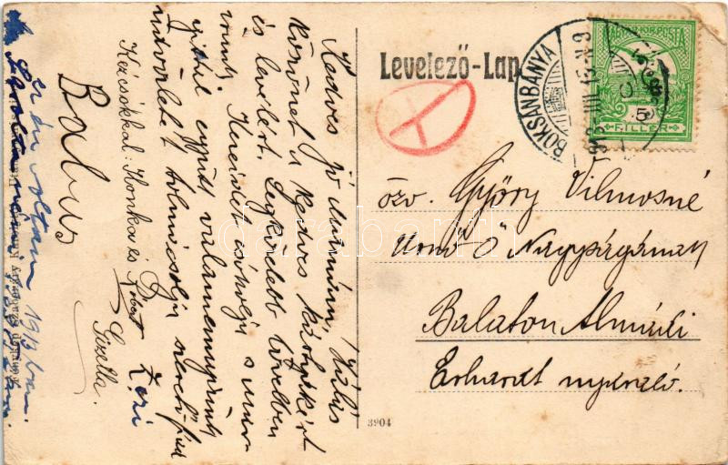 1913 Boksánbánya, Várboksán, Románbogsán, Németbogsán, Deutsch-Bogsan, Bocsa Montana; Erdészeti hivatal és lakás. A levél címzettje Győry Vilmosné Székács Etelka, az orosházi evangélikus lelkész, Győry Vilmos özvegye. Szabonáry Károly felvétele / forestry office and house (EB)