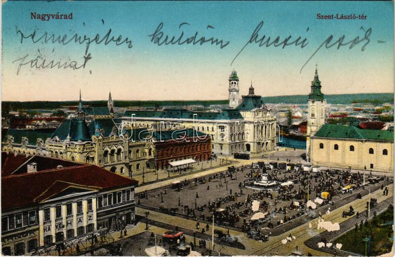 1915 Nagyvárad, Oradea; Szent László tér, városháza, piac, Általános Takarékpénztár, sörcsarnok és kávéház. Vasúti levelezőlapárusítás 35. sz. 1915. / square, town hall, market, savings bank, beer hall and café (Rb)