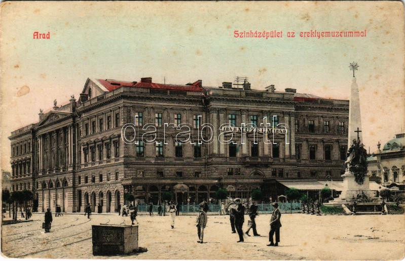 Leírás: Arad, színházépület az ereklyemúzeummal, 1848-1849, városi sörcsarnok, villamospálya / theater, museum, beer pub, tram line (fl)