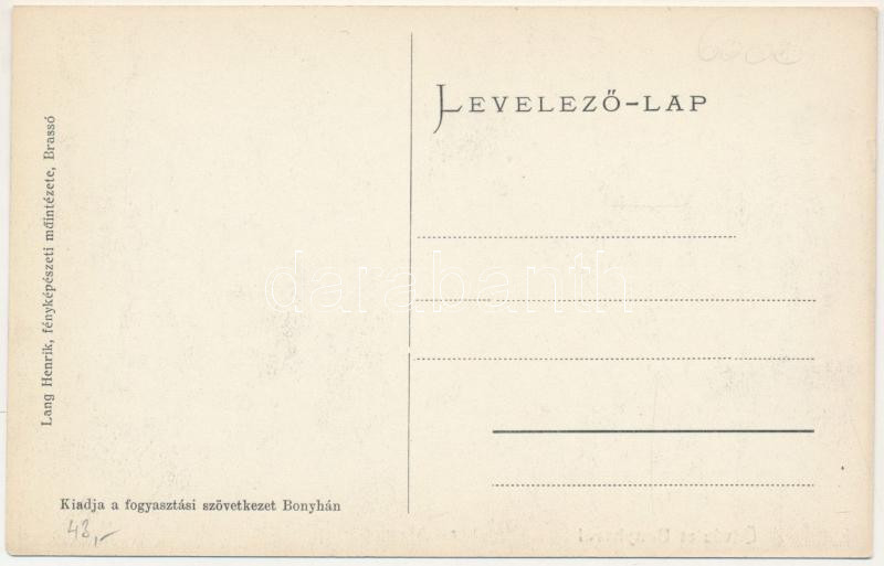 Leírás: Bonyha, Szászbonyha, Bahnea; Községháza. Fogyasztási szövetkezet kiadása. Lang Henrik fényképészeti műintézete felvétele (Brassó) / town hall