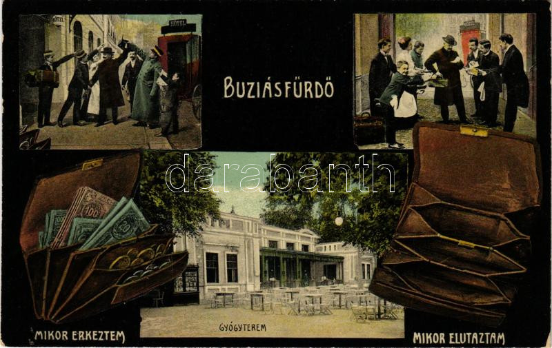 Leírás: Buziásfürdő, Baile Buzias; Gyógyterem, szálloda. Mikor érkeztem - mikor elutaztam humoros montázs. Francz József kiadása / spa hotel. Humour montage (EK)
