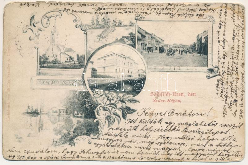 Leírás: Szászrégen, Sächsisch-Regen, Reghin; templom, gimnázium, utca, városliget / church, grammar school, street, park. Lichtdruck von Brüder Schuller & Comp. Art Nouveau, floral (r)
