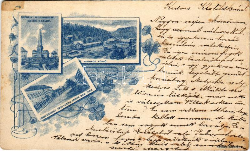 Székelyudvarhely, Odorheiu Secuiesc; Homoród fürdő, Székely millenniumi emlékoszlop, első utca a Kossuth Lajos utca / monument, spa, first street. floral, Art Nouveau (Rb)