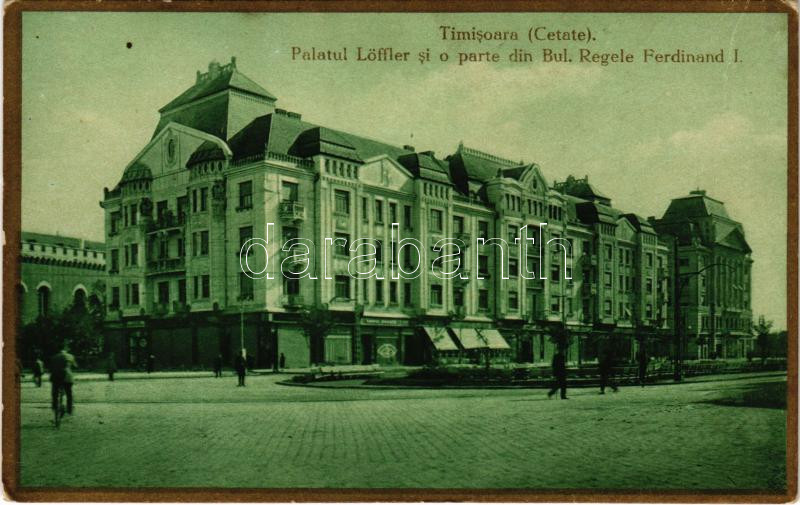 Temesvár, Timisoara; Palatul Löffler si o parte din Bul. Regele Ferdinand I. / Löffler palota, kerékpár, üzletek / palace, bicycle, shops (gyűrődés / crease)