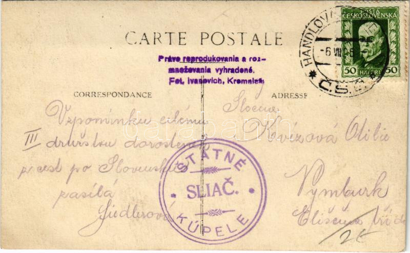 1925 Szliács-fürdő, Kúpele Sliac; Fot. Ivanovich photo https://www.darabanth.com/hu/514-Filatelia-kepeslap-numizmatika-mutargy-konyv-papirregiseg-ekszer-aukcio/515.0/Kepeslapok/Felvidek~1106/1925-Szliacs-furdo-Kupele-Sliac-Fot-Ivanovich-photo~II3151406