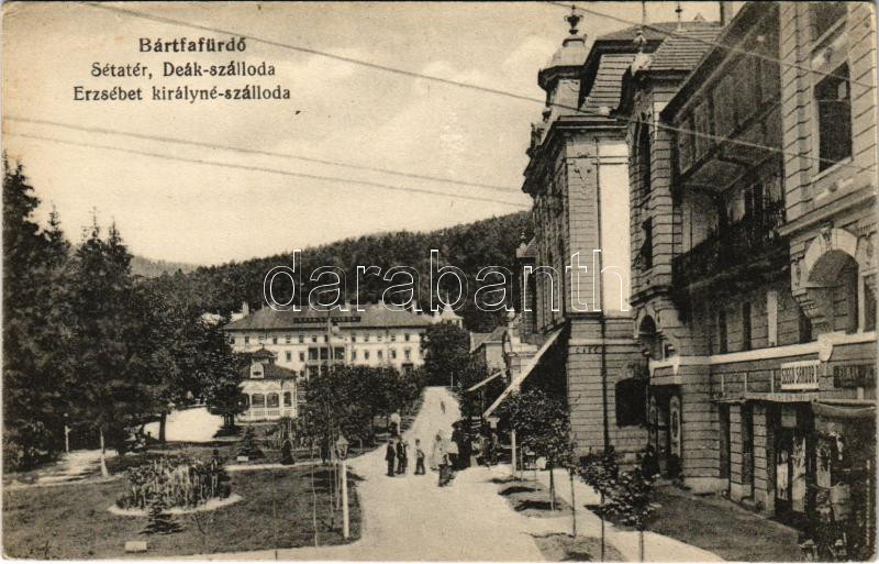 Leírás: Bártfafürdő, Bardejovské Kúpele, Bardiov, Bardejov; Sétatér, Deák szálloda, Erzsébet királyné szálloda, Kávéház, Szegő Sándor üzlete. Neumann Viktor kiadása / promenade, hotels, cafe, shops (EK)