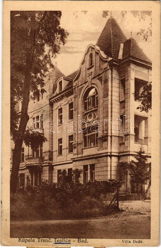 Trencsénteplic-fürdő, Kúpele Trencianske Teplice, Bad Trencsénteplic; ... https://www.darabanth.com/hu/514-Filatelia-kepeslap-numizmatika-mutargy-konyv-papirregiseg-ekszer-aukcio/515.0/Kepeslapok/Felvidek~1106/Trencsenteplic-furdo-Kupele-Trencianske-Teplice-Bad-Trencsenteplic-Deak-villa-furdo-G-~II3481135
