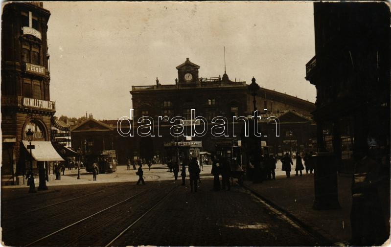 Leírás: 1917 Lille, Nordbahnhof / Gare de Lille-Flandres, Aux Mille Pendules, L'Essor, École Pigier, Automobiles Schneider Garage, Havez, Bock Tartarat / railway station, shops, advertisements, tram. photo + "Tábori postahivatal 650" (fl)