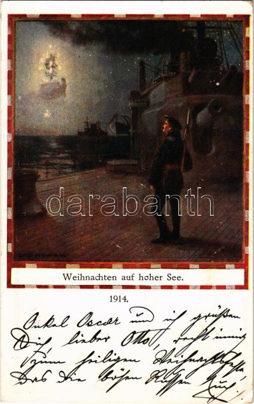 1914 Weihnachten auf Hoher See. 1914-1915. Offizielle Weihnachtskarte des Österreichischen Flottenvereines zu Gunsten der Kriegsfürsorge. Brüder Kohn Wien I. / WWI Austro-Hungarian Navy, K.u.K. Kriegsmarine art postcard with Christmas greeting s: Otto Nowak (EK)