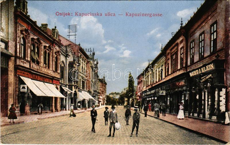 Leírás: 1916 Eszék, Essegg, Osijek; Kapucinska ulica / Kapuzinersgasse / Kapucinus utca, Lust és Klein, Cernuta és fia üzlete / street view, shops (EK)
