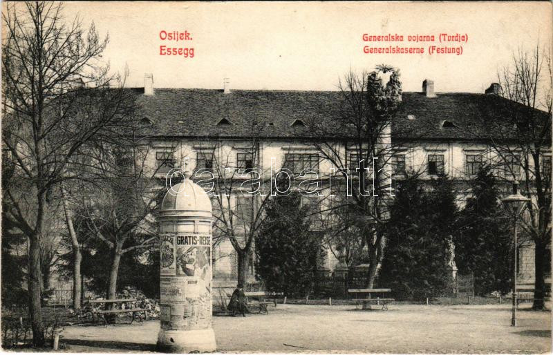 Eszék, Essegg, Osijek; Generalska vojarna (Tvrdja) / Generalkaserne (F... https://www.darabanth.com/hu/514-Filatelia-kepeslap-numizmatika-mutargy-konyv-papirregiseg-ekszer-aukcio/515.0/Kepeslapok/Horvatorszag~1107/Eszek-Essegg-Osijek-Generalska-vojarna-Tvrdja-Generalkaserne-Festung-laktanya-hirdetoo~II3458456