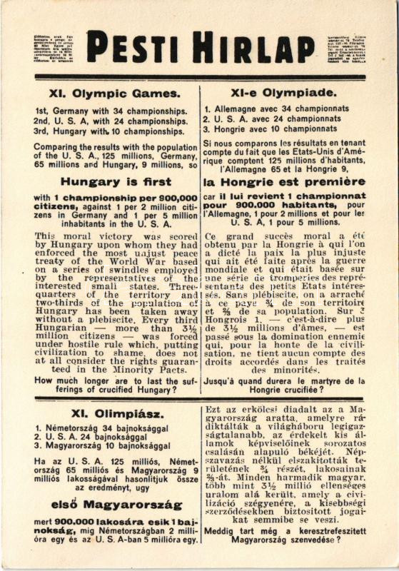 1936 Igazságot Magyarországnak! Hátoldalon Pesti Hírlap XI. Olimpiai cikke / Justice pour la Hongrie! / Justice for Hungary! Hungarian irredenta propaganda, article of the 1936 Olympic Games on the backside (EK)