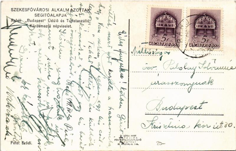 Leírás: Kőrösmező, Körösmező, Jaszinya, Jasina, Yasinia (Máramaros); Székesfővárosi Alkalmazottak Segítőalapja, Budapest üdülő és turistaszálló, népviselet / resort and tourist hotel, folklore