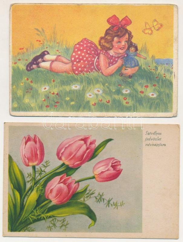 Leírás: 10 db RÉGI motívum képeslap vegyes minőségben: üdvözlőlapok / 10 pre-1945 motive postcards in mixed quality: greeting cards