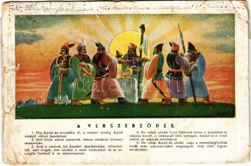 Leírás: 1943 Vérszerződés. Kállay László kiadása, Magyar Könyv / Hungarian Blood oath, irredenta art postcard s: Szörényi (r)