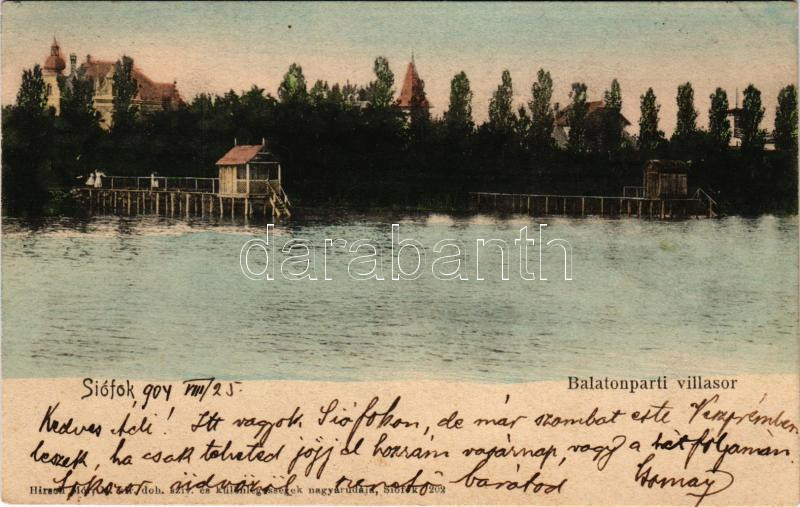 Leírás: 1904 Siófok, Balaton parti villasor fürdőkabinokkal. Hirsch Mór kiadása