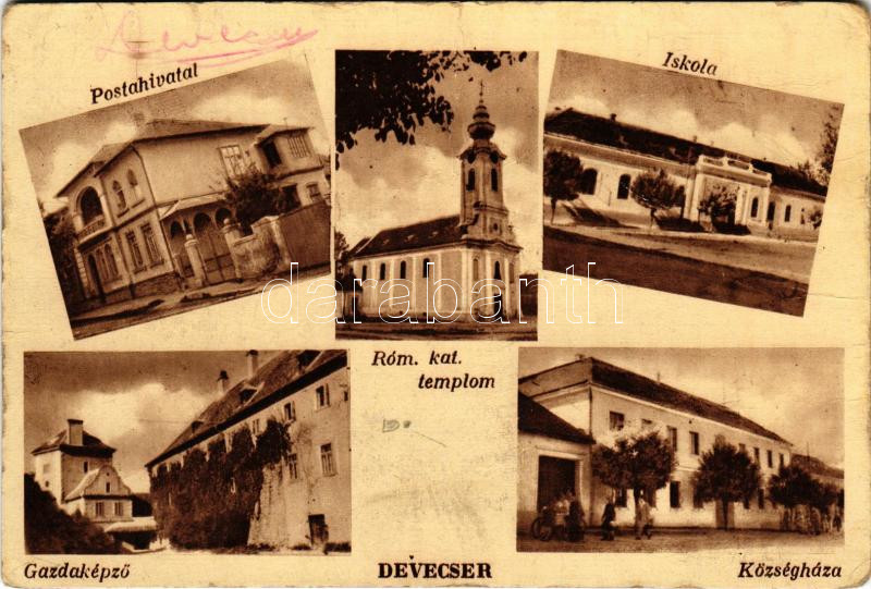 Leírás: Devecser, Postahivatal, Római katolikus templom, iskola, Gazdaképző, Községháza (fa)