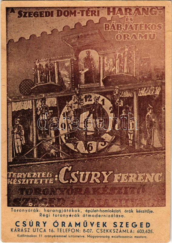Leírás: Szeged, Dóm téri harang- és bábjátékos óramű. A Csúry Óraművek, Csúry Ferenc toronyórakészítő reklámlapja (kis szakadás / small tear)