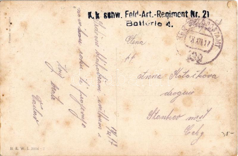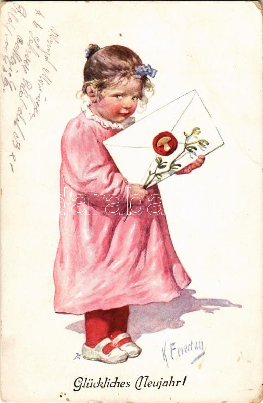 1917 Glückliches Neujahr / New Year greeting art postcard with girl and letter. B.K.W.I. 3004-2. s: K. Feiertag + "K. k. schw. Feld-Art.-Regiment Nr. 21. Batterie 4" (lyuk / hole)