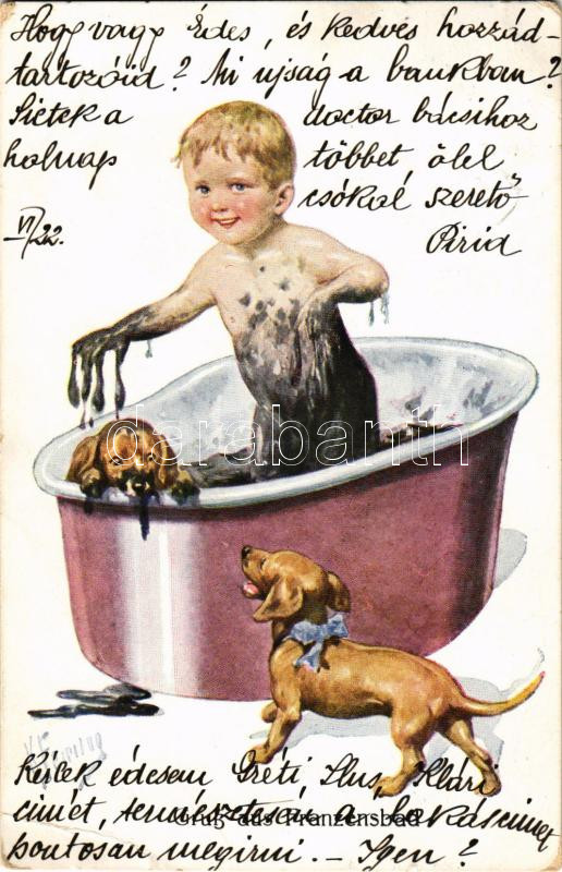 Leírás: 1917 Gruss aus Franzensbad (Frantiskovy Lázne) / mud spa humour art postcard with boy and dogs. B.K.W.I. 225-3. s: K. Feiertag (EB)