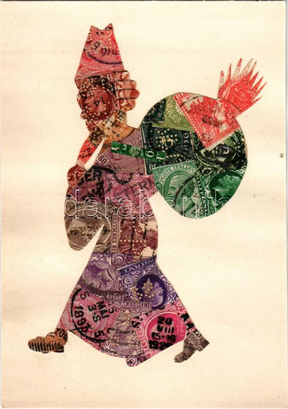 Leírás: Mikulás. Bélyegekből kivágott és összeragasztott képeslap. Budai nyomda / Saint Nicholas. Made out of stamps