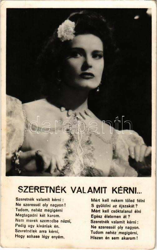 Karády Katalin, "Szeretnék valamit kérni... dala a Halálos Csók c... https://www.darabanth.com/hu/514-Filatelia-kepeslap-numizmatika-mutargy-konyv-papirregiseg-ekszer-aukcio/515.0/Kepeslapok/Szinesz~1188/Karady-Katalin-Szeretnek-valamit-kerni-dala-a-Halalos-Csok-cimu-Hausz-Maria-filmbol-~II3476741