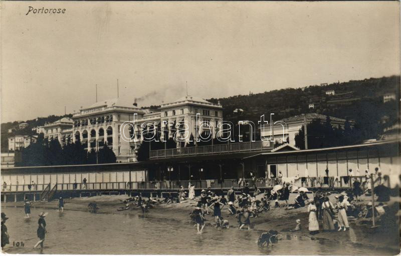1914 Portoroz, Portorose; beach, bathers, hotel https://www.darabanth.com/hu/514-Filatelia-kepeslap-numizmatika-mutargy-konyv-papirregiseg-ekszer-aukcio/515.0/Kepeslapok/Szlovenia~1145/1914-Portoroz-Portorose-beach-bathers-hotel~II3204532
