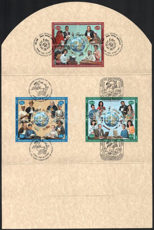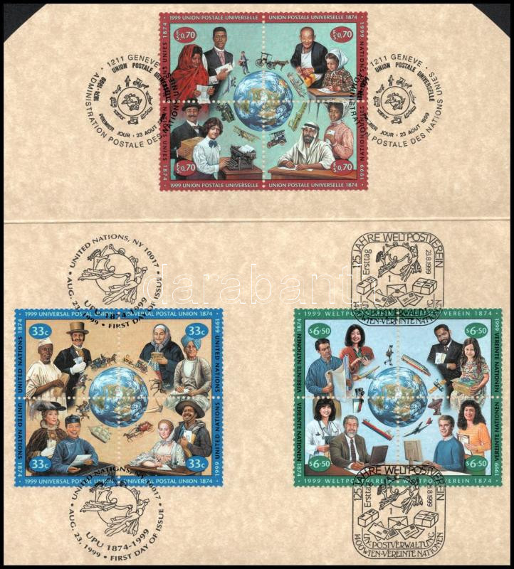 Leírás: ENSZ 1999 3 klf négyestömb és elsőnapi bélyegzés emléklapon