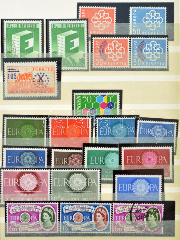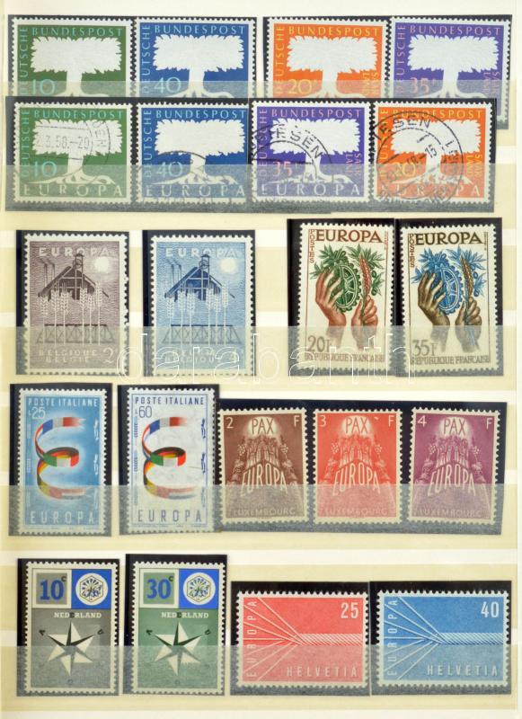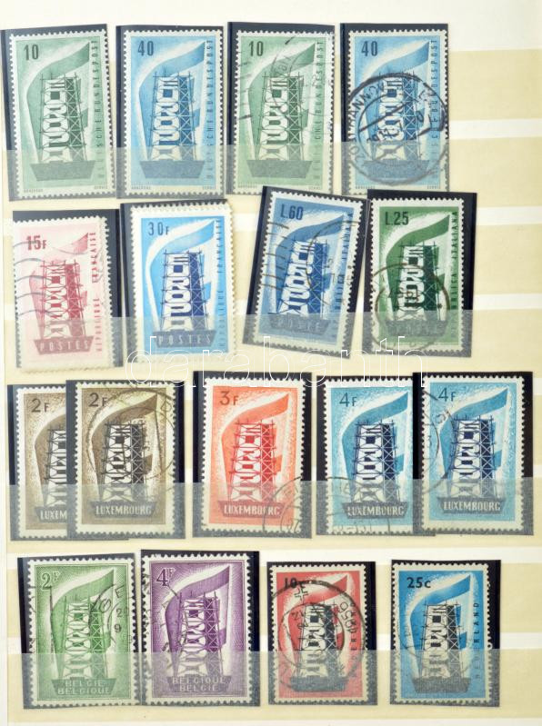 Europa CEPT kiadások 1956-1972 sok jó korai értékkel 16 lapos közepes berakóban. Tartalmas összeállítás, több mint 800 db bélyeg magas katalógus érték!! Europe CEPT collection with better issues and duplicates 1956-1972, in medium size stockbook