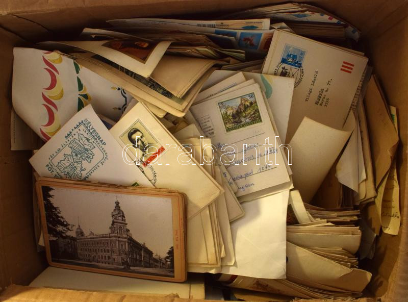 Leírás: Hullámkarton láda tele magyar és külföldi FDC-kkel, levelekkel, alkalmi küldeményekkel közte képeslapok, régi fényképek stb. Érdekes anyag!