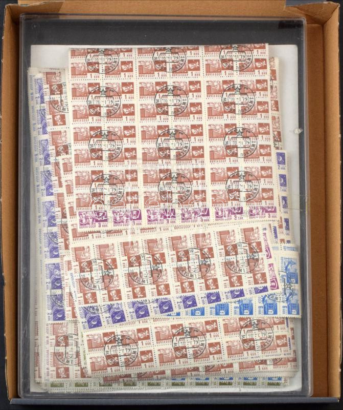 Leírás: Sok ezer szovjet forgalmi bélyeg ívszél nélküli ívekben és ívdarabokban, műanyag tálcán