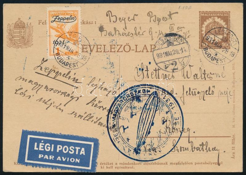 Leírás: 1931 Zeppelin magyarországi körrepülés levelezőlap 1P Zeppelin bélyeggel