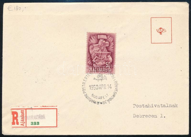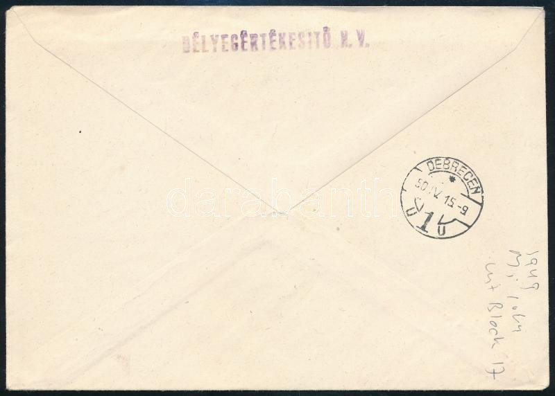 Leírás: 1949 Lánchíd III blokkból kitépett bélyeg 1950-ben feladott postai ajánlott levélen (70.000)