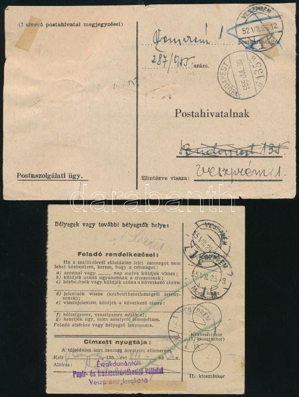 1955 Csomagszállító 5.20 helyett 5Ft bérmentesítéssel, hozzá Díjhiányjelentés, melyen a hiányzó 20f díjat + 4f büntetést kellett volna leróni, de 2 x 60f bélyeggel 96f többletet ragasztottak rá
