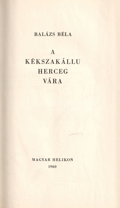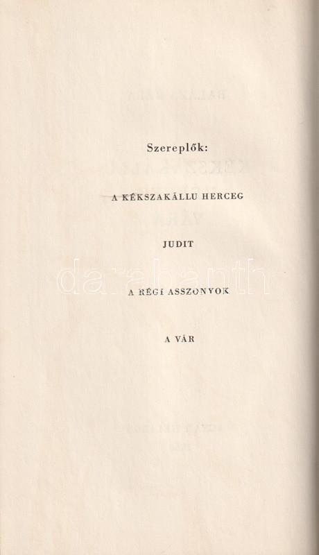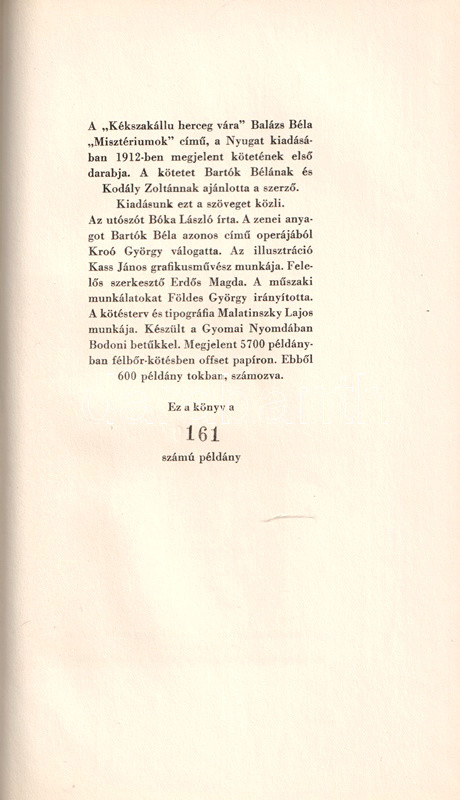 Kolofon: "A Kékszakállú herceg vára Balázs Béla Misztériumok című, a Nyugat kiadásában 1912-ben megjelent kötetének első darabja. A kötetet Bartók Bélának és Kodály Zoltánnal ajánlotta a szerző. Kiadásunk ezt a szöveget közli. Az utószót Bóka László írta. A zenei anyagot Bartók Béla azonos című operájából Kroó György válogatta. Az illusztráció Kass János grafikusművész munkája. Tipográfia és kötésterv Malatinszky Lajos munkája. Készült a Gyomai Nyomdában Bodoni betűkkel. Megjelent 5700 példányban félbőr-kötésben, offset papíron. Ebből 600 példány tokban, számozva. Ez a könyv a 161. számú példány".