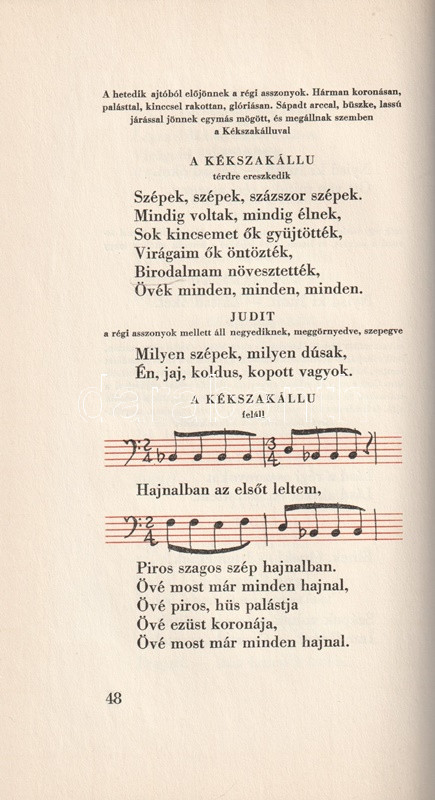 Oldalszámozáson belül kottarészletekkel, illetve Kass János színes linómetszeteivel. Az utószóban Bóka László irodalomtörténész az első világháborút közvetlenül megelőző évtized színházi tendenciáit elemzi, a színpadokat uraló polgári naturalista színjátszás és népszín-előadások markáns elítélésével.