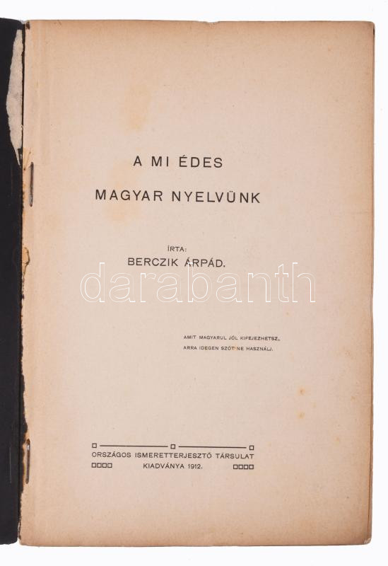 Berczik Árpád: A mi édes magyar nyelvünk. Bp., 1912, Országos Ismerett... https://www.darabanth.com/hu/514-Filatelia-kepeslap-numizmatika-mutargy-konyv-papirregiseg-ekszer-aukcio/515.0/Konyvek/Konyvek-Egyeb-ritkasagok~633/Berczik-Arpad-A-mi-edes-magyar-nyelvunk-Bp-1912-Orszagos-Ismeretterjeszto-Tarsulat-75-plus~II3460661