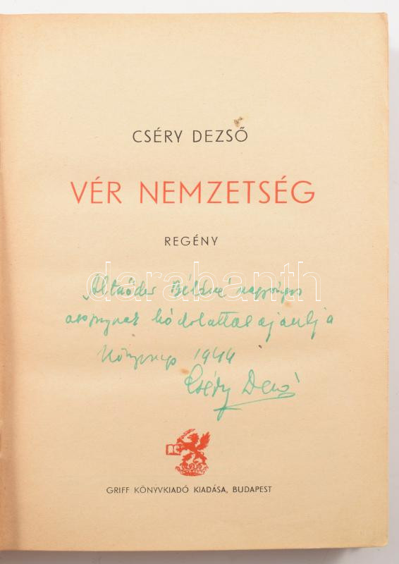 Leírás: Cséry Dezső: Vér nemzetség. Bp., 1943, Griff Könyvkiadó. Kiadói félvászon kötésben, könyvtest elvált. A szerző által dedikált példány!