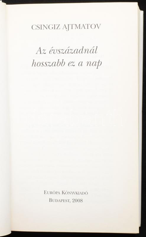 Csingiz Ajtmatov: Az évszázadnál hosszabb ez a nap. Bp., 2008, Európa.... https://www.darabanth.com/hu/514-Filatelia-kepeslap-numizmatika-mutargy-konyv-papirregiseg-ekszer-aukcio/515.0/Konyvek/Konyvek-Egyeb-ritkasagok~633/Csingiz-Ajtmatov-Az-evszazadnal-hosszabb-ez-a-nap-Bp-2008-Europa-Kiadoi-kartonalt-papir~II3463299