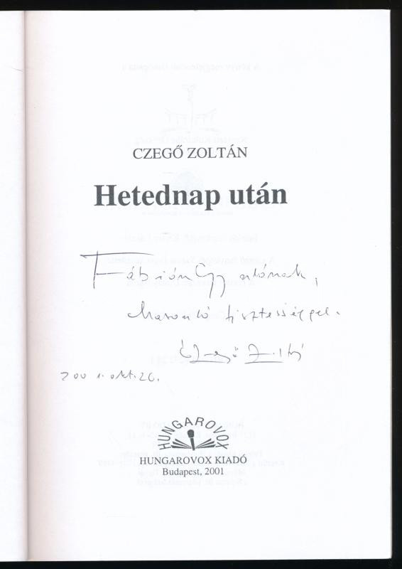 Leírás: Czegő Zoltán: Hetednap után. DEDIKÁLT! Bp., 2001, Hungarovox. Kiadói papírkötés, jó állapotban.