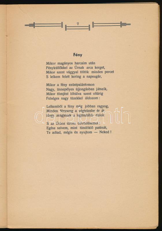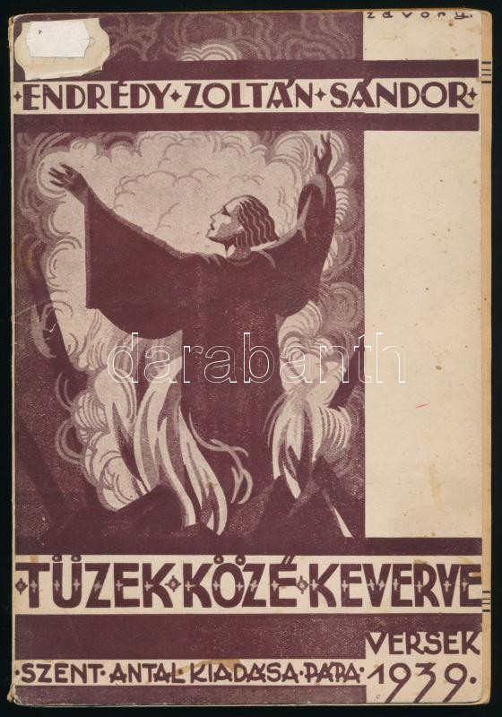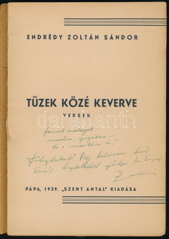 Endrédy Zoltán Sándor: Tüzek közé keverve. Versek. A szerző, Endrédy Zoltán Sándor (1912-1996) katolikus pap, plébános, hittanár, költő által dedikált példány. Pápa, 1939, Szent Antal, 111+(1) p. Egyetlen kiadás. Kiadói papírkötés, kissé sérült, foltos borítóval és gerinccel, sérült, részben szétváló fűzéssel. (Ritka!)