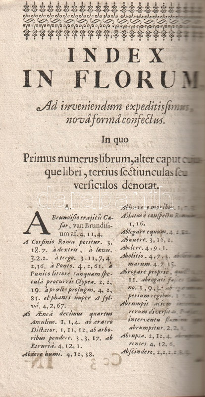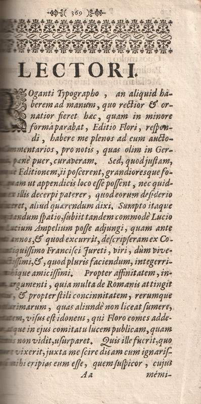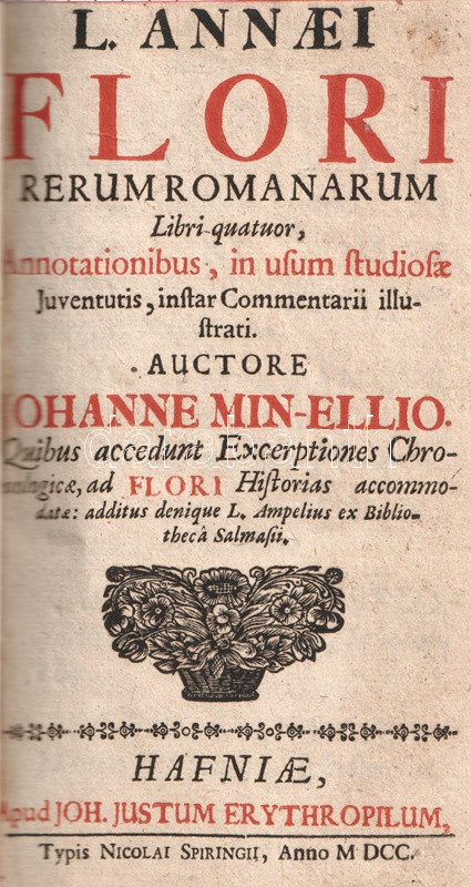 Florus, Lucius Annaeus: Rerum Romanarum Libri quatuor, Annotationibus, in usum studiosae Juventutis, instar Commentarii illustrati. Auctore Johanne Minellio. Quibus accedunt Excerptiones Chronologicae, ad Flori Historias accomodatae: additus denique L. Ampelius ex Bibliotheca Salmasii. [Koppenhága] Hafniae, 1700. Apud Joh. Justum Erythropilum. Typis Nicolai Spiringii. [14] + 405 + [91] p.