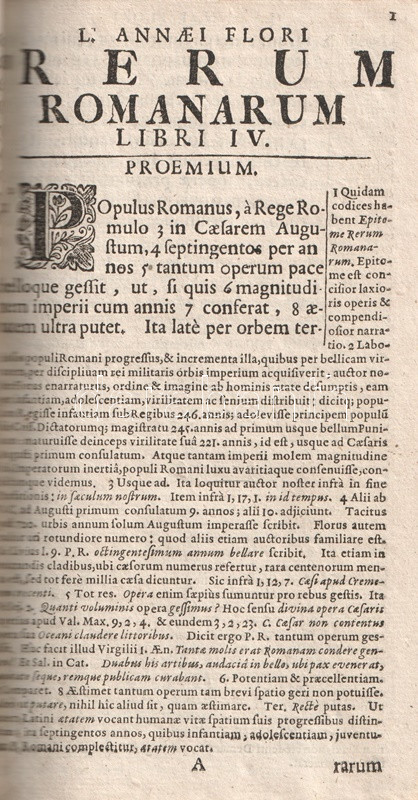 Lucius Annaeus Florus (74-147), Hadrianus és Antonius Pius császárok történetírója. Történetírása Róma háborúit beszéli el a királyok korától Antonius és Kleopátra háborújáig. A florusi történetírást Jan Minell (1625-1683) dán filológus gazdag lábjegyzetei kísérik, a munka ebben a formában először 1683-ban jelent meg.