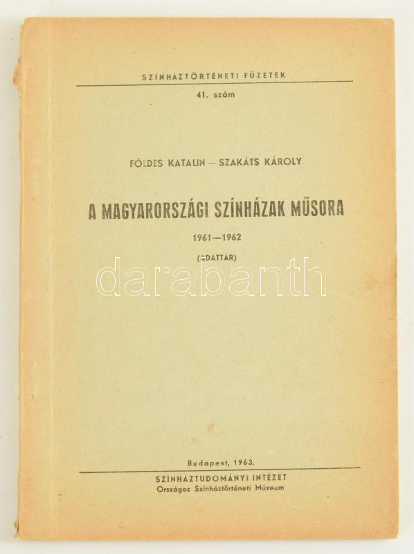 Földes - Szakáts: A magyarországi színházak műsora 1961-1962. Adattár.... https://www.darabanth.com/hu/514-Filatelia-kepeslap-numizmatika-mutargy-konyv-papirregiseg-ekszer-aukcio/515.0/Konyvek/Konyvek-Egyeb-ritkasagok~633/Foldes-Szakats-A-magyarorszagi-szinhazak-musora-1961-1962-Adattar-Bp-1963-Szinhaztu~II3465087