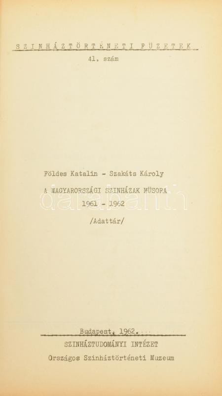 Leírás: Földes - Szakáts: A magyarországi színházak műsora 1961-1962. Adattár. Bp., 1963. Színháztudományi Intézet. 96p.