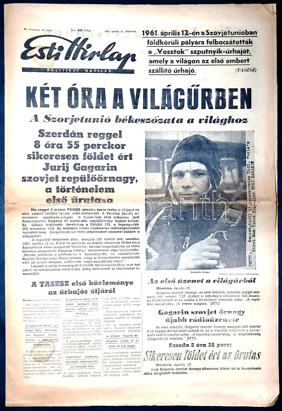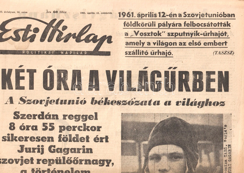 [Folyóirat] "Két óra a világűrben. A Szovjetunió békeszózata a világhoz". Az Esti Hírlap politikai napilap lapszáma az első emberi űrutazás, Jurij Gagarin szovjet őrnagy űrutazása alkalmából. [VI. évfolyam, 86. szám.] (1961. április 13.)